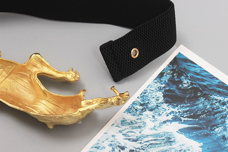 The buckle on the Wild Buckle Belt is truly a work of art. It is a mold of either a tiger or 2 elephants, making it truly unique. The golden color of the buckle adds a touch of elegance to the belt and will complement any outfit. The large size of the buckle makes it a statement piece that is sure to be a conversation starter.